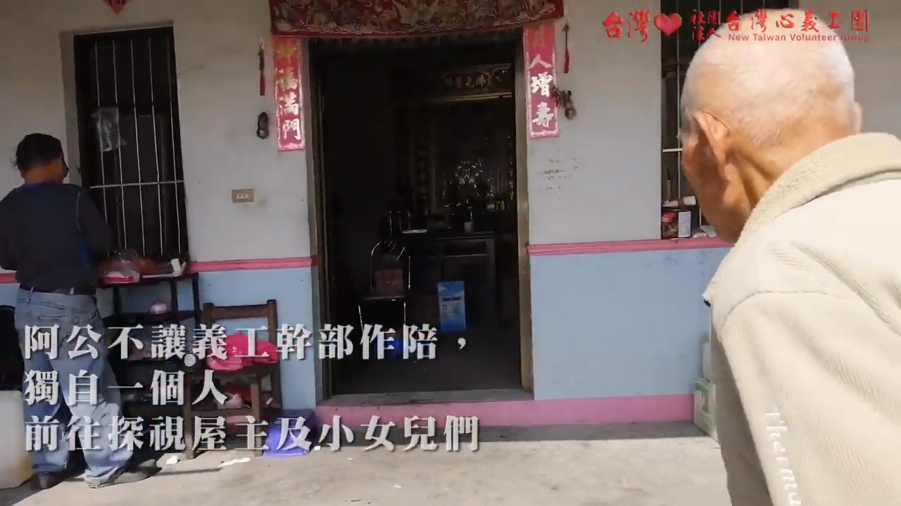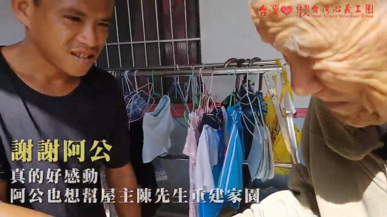 ▼社團法人台灣心義工團得知陳家處境,便號召義工幫忙蓋房。阿公也在志工的帶領下,拖著些微不穩的步伐,親手把1萬塊交給陳爸。雖然彼此沒有太多言語交流,但陳爸的表情充滿感謝,阿公也露出欣慰笑容,陳家小女兒更是充滿活力大喊:「阿公好!」畫面無比溫馨。