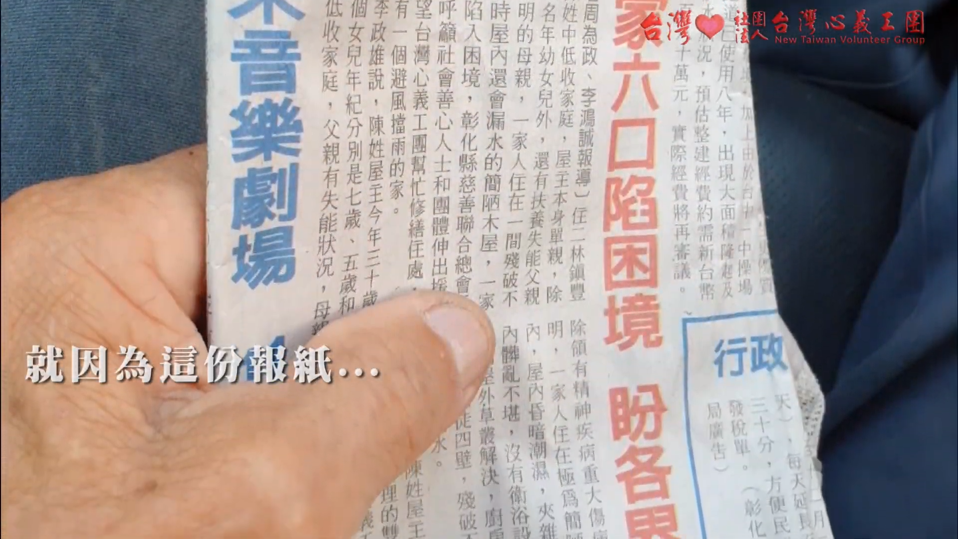 ▼家住台南的阿公在報紙看到一家六口貧困的消息,得知對方住在彰化,便獨自搭公車到火車站,再一路坐到彰化。下車就拿著報紙問人,想找到這個弱勢家庭在哪裡。