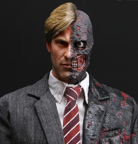 ▼「雙面人」原名哈維登特(Harvey Dent),原本是檢察官的他因為一半身體被潑硫酸而失常,成為了高譚市的其中一個超級反派,喜歡用擲硬幣的方式來決定其他人的下場。