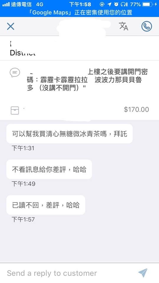 ▼原po貼出一張跟客人的對話,只見客人在備註中說:「上樓之後要講開門密碼,霹靂卡霹靂拉拉,波波力那貝貝魯多,沒有講的話不開門」。不僅如此,客人還要求說:「可以幫我買清心無糖微冰青茶嗎?」外送員可能在騎車,不方便回訊息,客人又說:「不看訊息給你差評,哈哈」、「已讀不回差評,哈哈」。