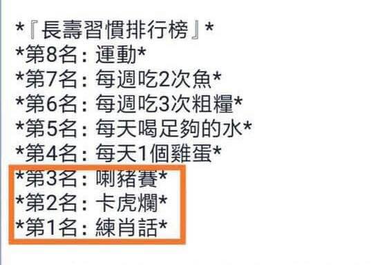 ▼原來在這張「長壽習慣排行榜」上,除了大家最常看到的運動和飲食方式以外,排名前三的竟然是「喇豬賽」、「卡虎爛」和「練肖話」!