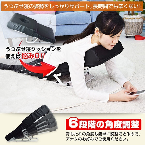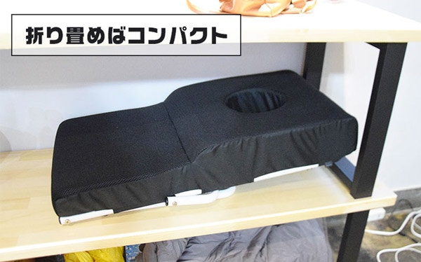 ▼這款靠墊的設計猶如按摩床一樣,頭部的部分有一個人臉大小的孔洞,平常不用的話可以折疊收納起來。