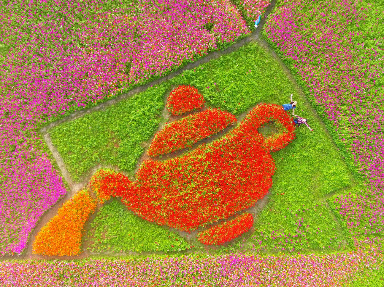 ▼副展區是以花田為主角,包括向日葵、百日草、波斯菊等等各式各樣的花毯通通都在這裡,有茶壺造行的「迎賓奉茶」、蝴蝶、星星等多種圖案,還有全場最大亮點,就是這長達43公尺的聖誕樹形狀花田,使用空拍機就能拍出這壯觀的美照!