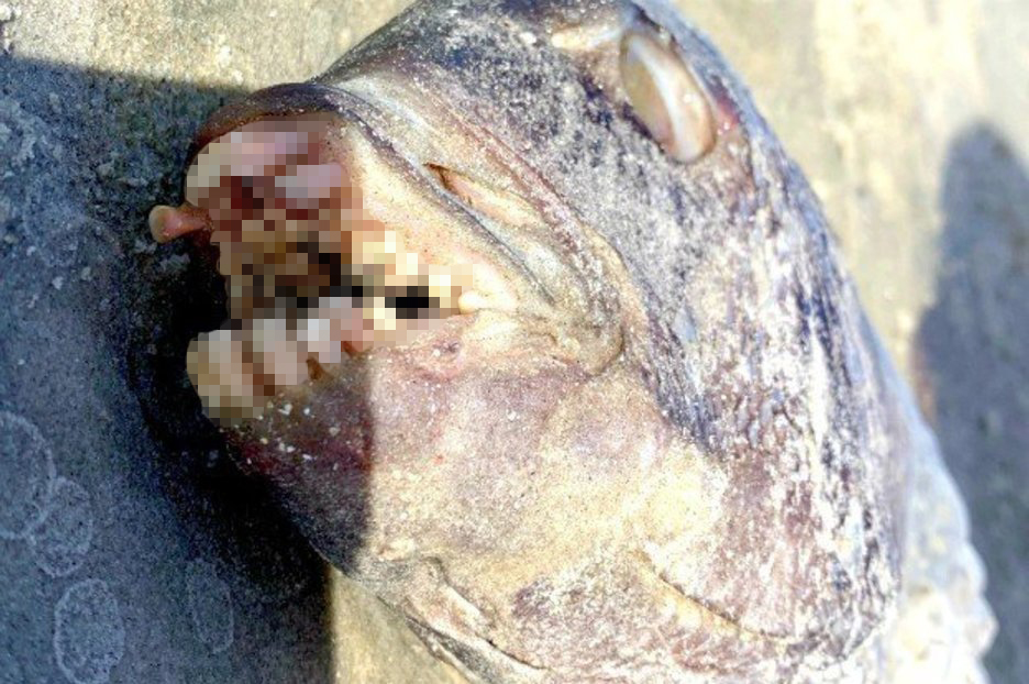 ▼幾個月前,美國喬治亞州聖西蒙島也出現了一條「人面魚」。當時31歲居民Maleah Burrows帶著3歲的兒子到海岸散步,沒想到在沙灘上看到了一條大魚。牠身上的鱗片掉了不少,張開的嘴巴裡露出整排牙齒。Maleah被嚇到,連忙將魚的照片po到了社群網站上。