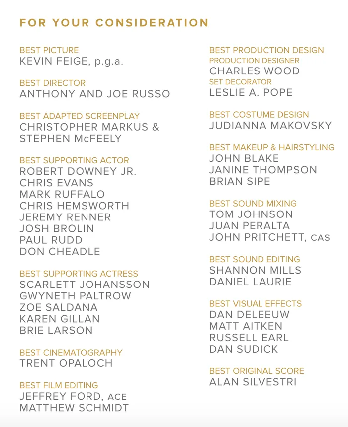 ▼迪士尼為《復4》報名了最佳影片獎,羅素兄弟的最佳導演獎,而小勞勃道尼、克里斯伊凡、馬克魯法洛、克里斯漢斯沃、傑瑞米雷納、喬許布洛林、保羅路德、唐奇鐸等人報了最佳男配角,史嘉蕾喬韓森、葛妮絲派特蘿、柔依珊達娜、凱倫吉蘭、布麗拉森等人報了最佳女配角獎。