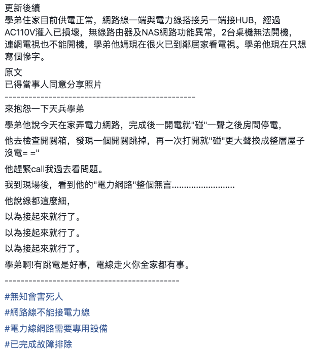 ▼原PO表示自己接到學弟來電時,對方的語氣非常慌張,一直猛說「在家弄電力網路,完成後一開電就『碰』一聲房間就停電了,去檢查開關箱,發現一個開關跳掉,再一次打開,結果就『碰』更大聲,換成整層屋子沒電」!結果原PO趕來一看,當場就無言!