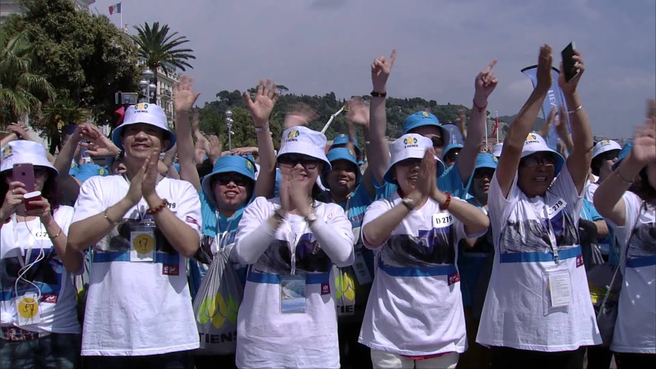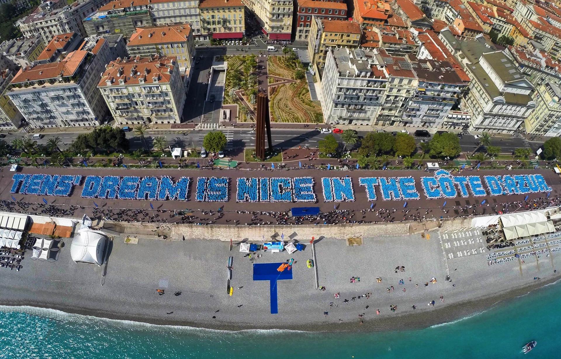 ▼他們還選了一天,全部穿上藍色、白色的服裝,聚集在尼斯蔚藍海岸的岸邊,用人擺出了「天獅集團的夢想就在尼斯蔚藍海岸」的字眼,創下了金氏世界紀錄中最大規模人體排字的記錄。