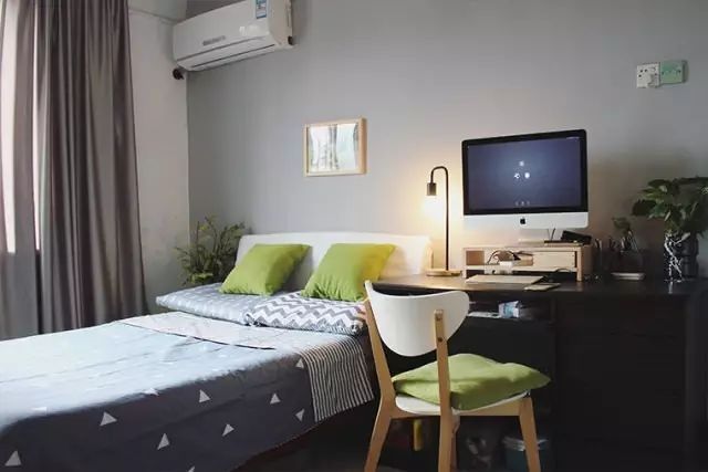 ▼主卧的一面牆壁也刷成了灰色,5L的灰色乳膠漆剛好可以刷兩面牆,淺灰搭配綠色,簡約大方。