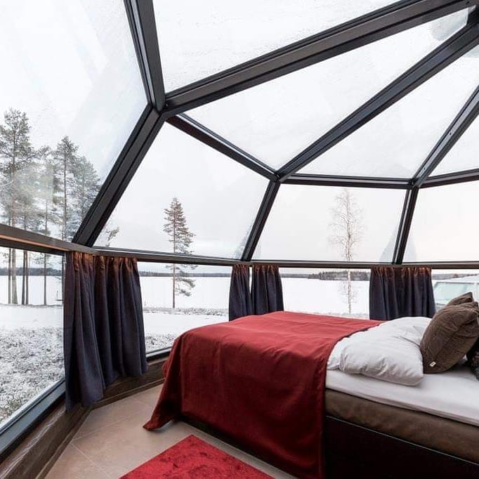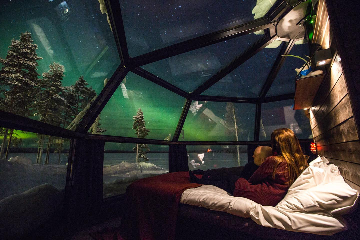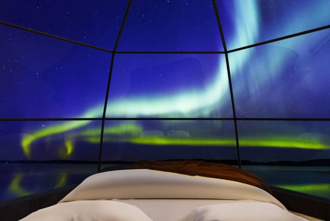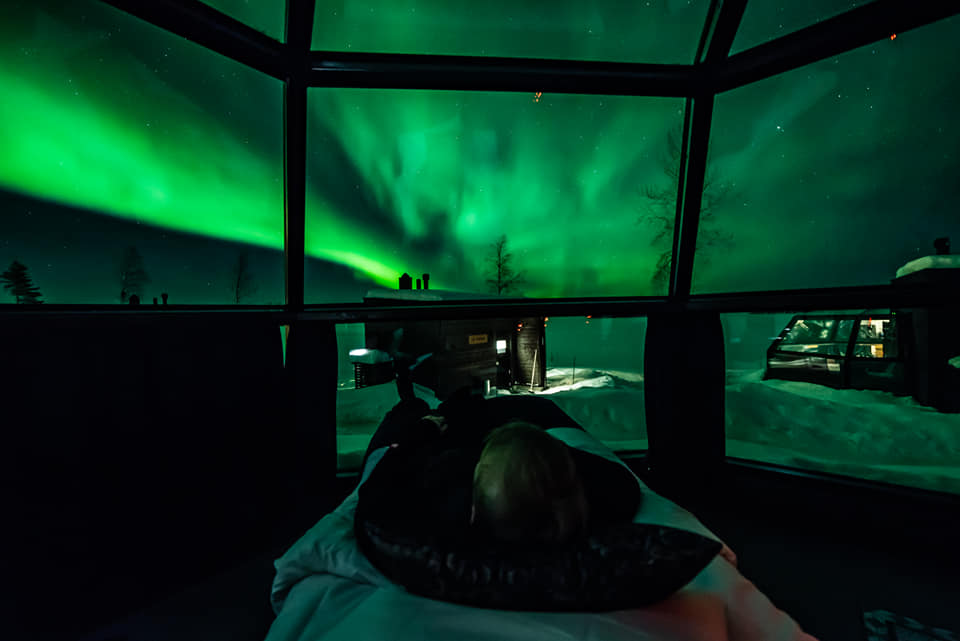 ▼飯店提供了透明的玻璃天花板,讓你可以躺在床上欣賞極光,在極光的環繞之下入睡。
