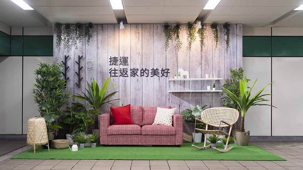 ▼七張站住宅生活圈發展快速,因應近年很夯的舒適自然風居家佈置,IKEA示範如何將大自然元素帶進家中,在票口旁運用戶外家具以及大量植栽創造了一塊綠色天地,為緊湊的生活注入一抹清新,也提供居家陽台空間的佈置靈感;站內廣場則有客廳休閒空間,使用取材自然的松木及藤製產品,創造綠意盎然的城市綠洲,讓回家的路途多了一份度假悠閒感。