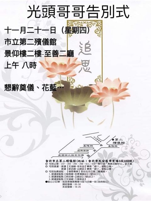 ▼也有一位自稱「光頭哥哥」姐姐的網友,在網路上發文表示「感謝眾多朋友對我弟弟俊傑的支持與愛護,成就了他短暫歲月得已發光發熱的舞台,在人生的最後旅程,盡情展現他對表演、歌唱的熱情以及英語長才。我摯愛的弟弟俊傑已於11/13離去,粉絲們對他的要求(祝福影片或歌曲)都一一註記在房間的大牆上,只是這一次,很抱歉,光頭哥哥要失約了。」