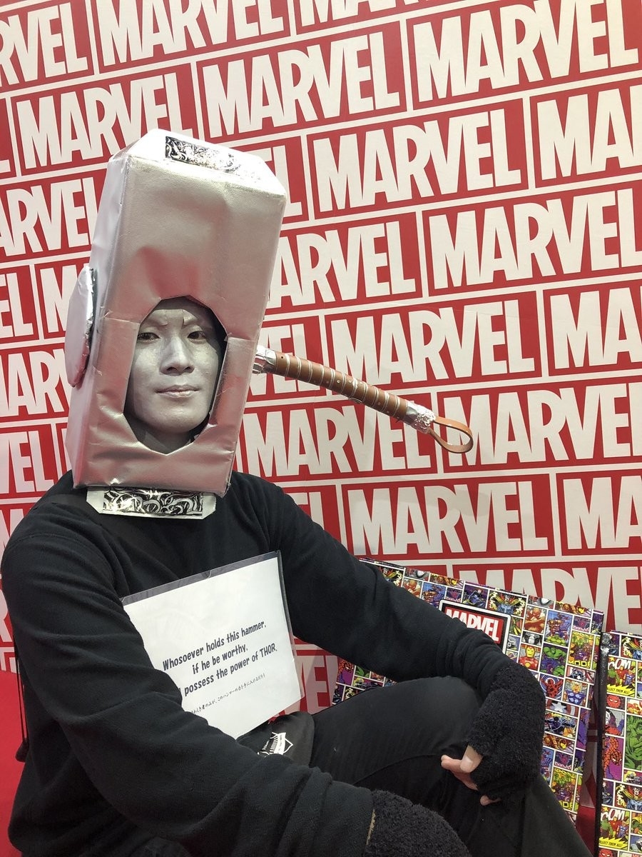 ▼為了讓偶像記住自己,很多粉絲cos成電影中的角色。正常的裝扮不夠吸引人,最好加一點創意。日本推主「しゅんっ」就裝扮成「雷神之鎚」,來參加「雷神索爾」的見面會。