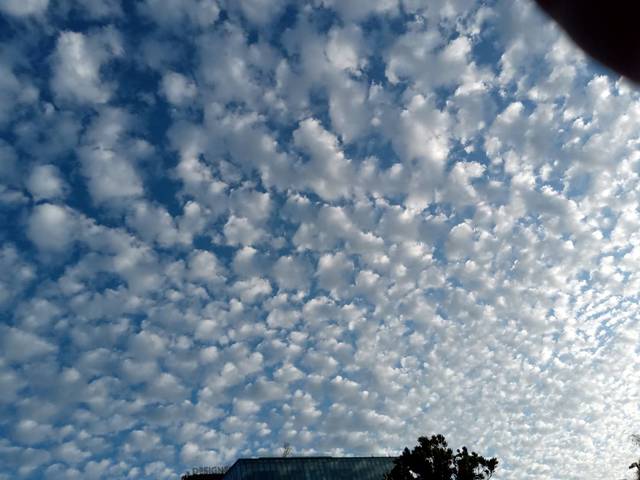▼中央氣象局的副局長鄭明典解釋,其實這個天空現象名為「高積雲」,是隔天將要變天的前兆!原來層積雲是由小水滴所組成,大家常見的層積雲都是由小雲塊排列成片成層,雖然與高積雲非常相似,不過其高度較低、雲塊也較大。這些積層雲可能是由高積雲降低、增大而形成,也有可能由層雲上升發展而成。