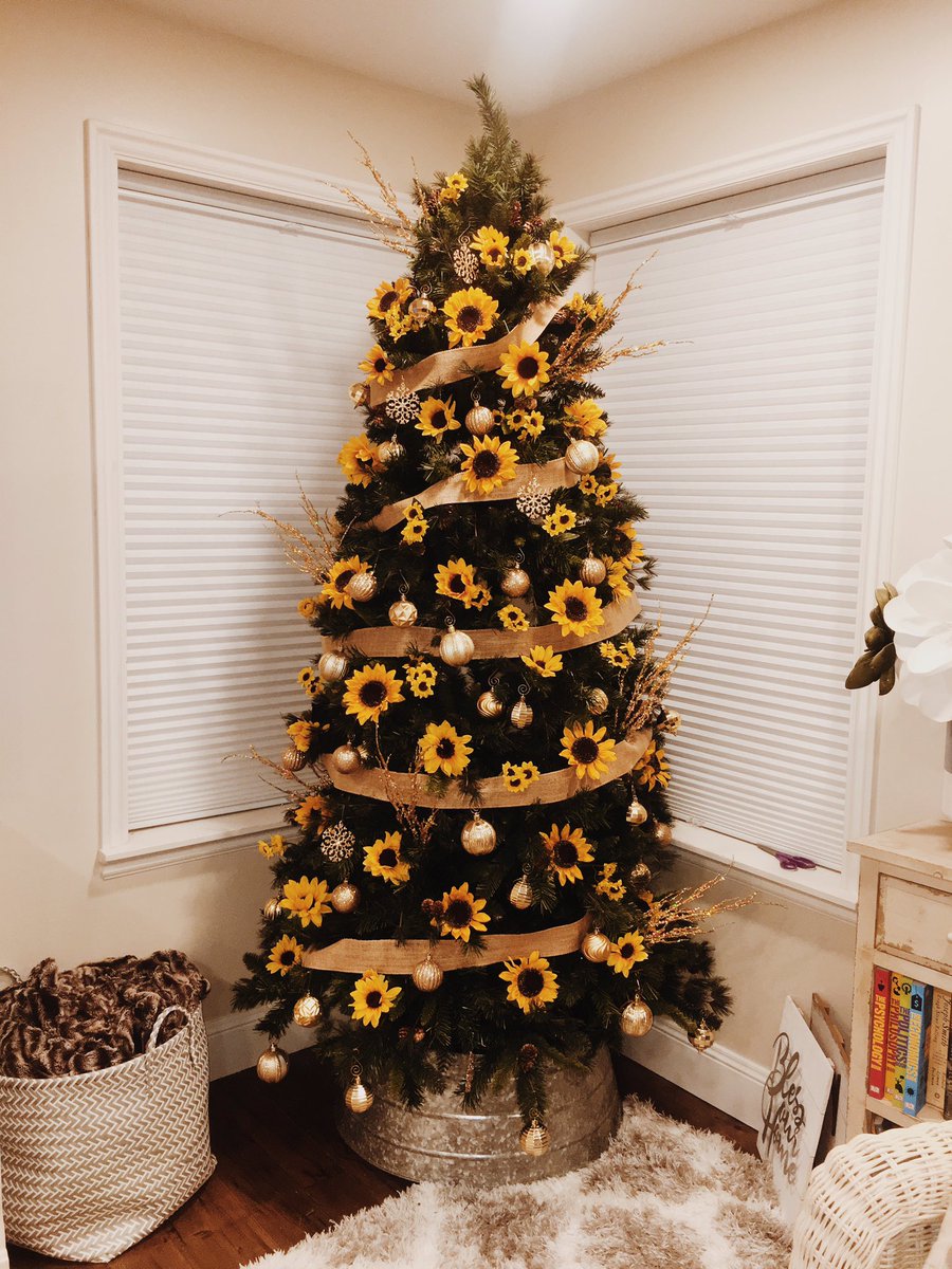 ▼這位推主用大大小小的向日葵裝飾聖誕樹,再加上雪花掛飾、金色絲帶等等,讓整棵樹看起來華麗又時尚。