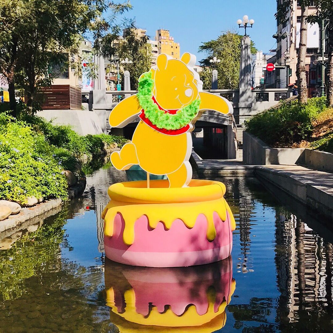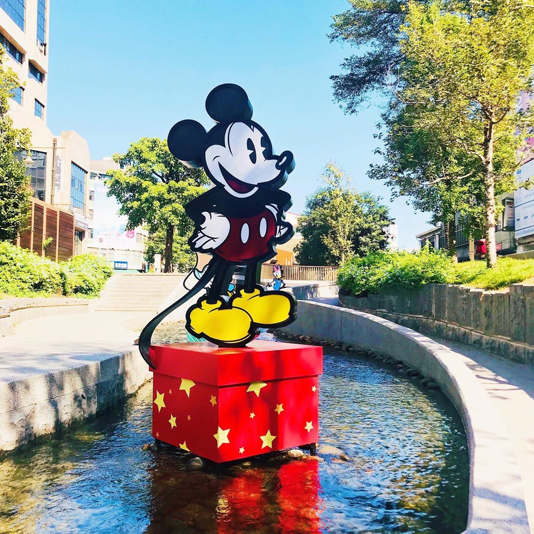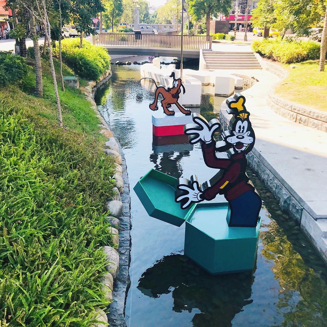 ▼綠川水岸廊道在白天可以拍出綠茵流水的優雅景緻,配上可愛的迪士尼角色們,讓這裡的氛圍更活潑有趣!