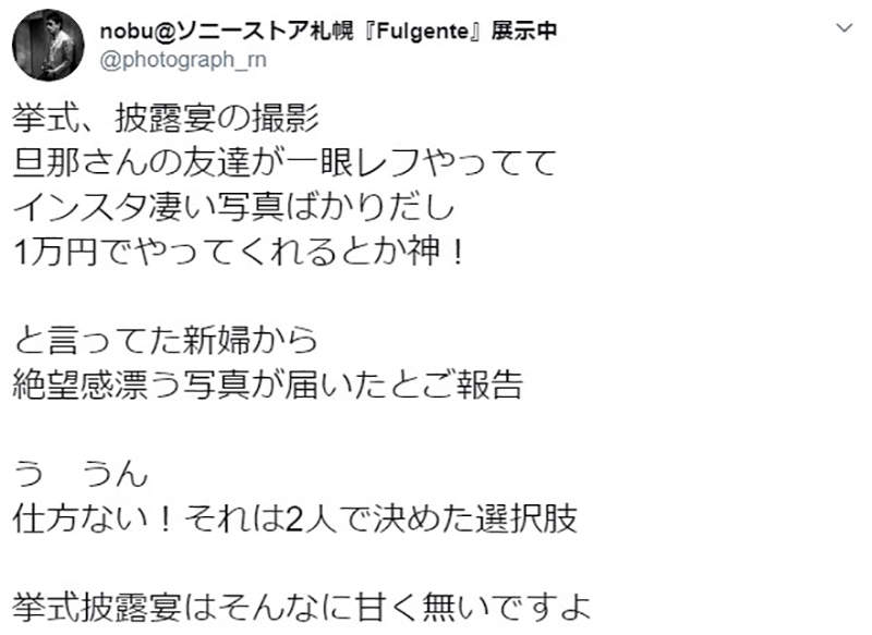 ▼藤崎延明在推特中表示,「『婚禮攝影想拜託丈夫一個有單眼相機的朋友來拍,他的IG都是超厲害的照片,只要1萬日圓就可以幫忙太神了!』原本這麼說的新娘後來向我報告收到的照片令人完全傻眼,這是2人下的決定也沒有辦法,所以說婚攝才沒那麼簡單啊!」