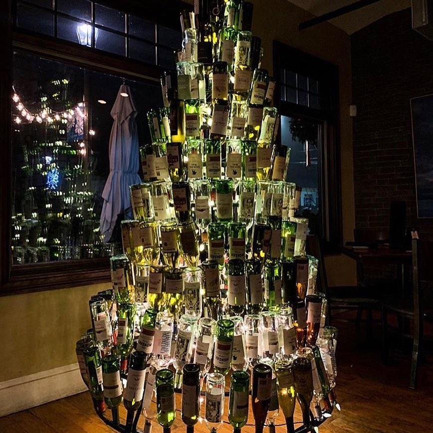 ▼不過近年來環保意識抬頭,比起到野外砍伐真正的聖誕樹回家,人們更傾向利用其他替代品來做出聖誕樹,其中「空酒瓶」就是非常適合的材料!