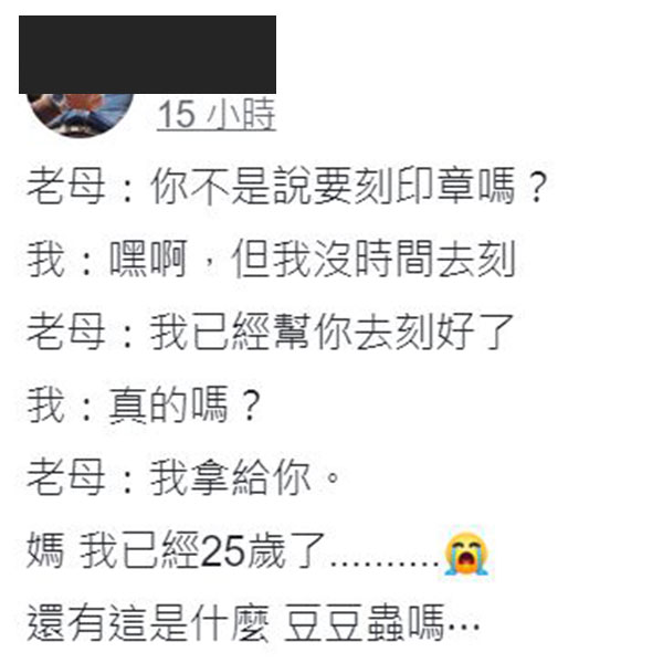 ▼原po已經25歲,早就過了喜歡卡通印章的年紀,而且這印章也不適合帶到職場,在公司根本不敢用。他無奈說:「媽,我已經25歲了,還有這是什麼,豆豆蟲嗎?」
