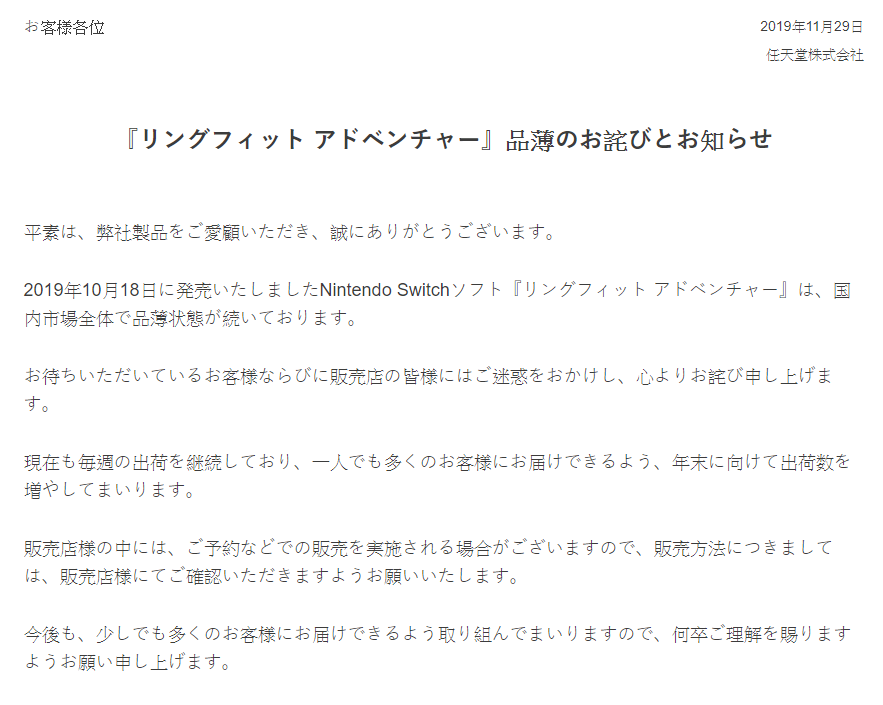▼日本任天堂發出的道歉聲明寫道,「造成等待的顧客和經銷商的不便,我們致上最深的歉意。為了解決缺貨情況,我們承諾『每週將會持續發貨,也會在年底前增加發貨量』,致力消化目前的訂單,希望玩家可以理解現在狀況及任天堂的努力!」