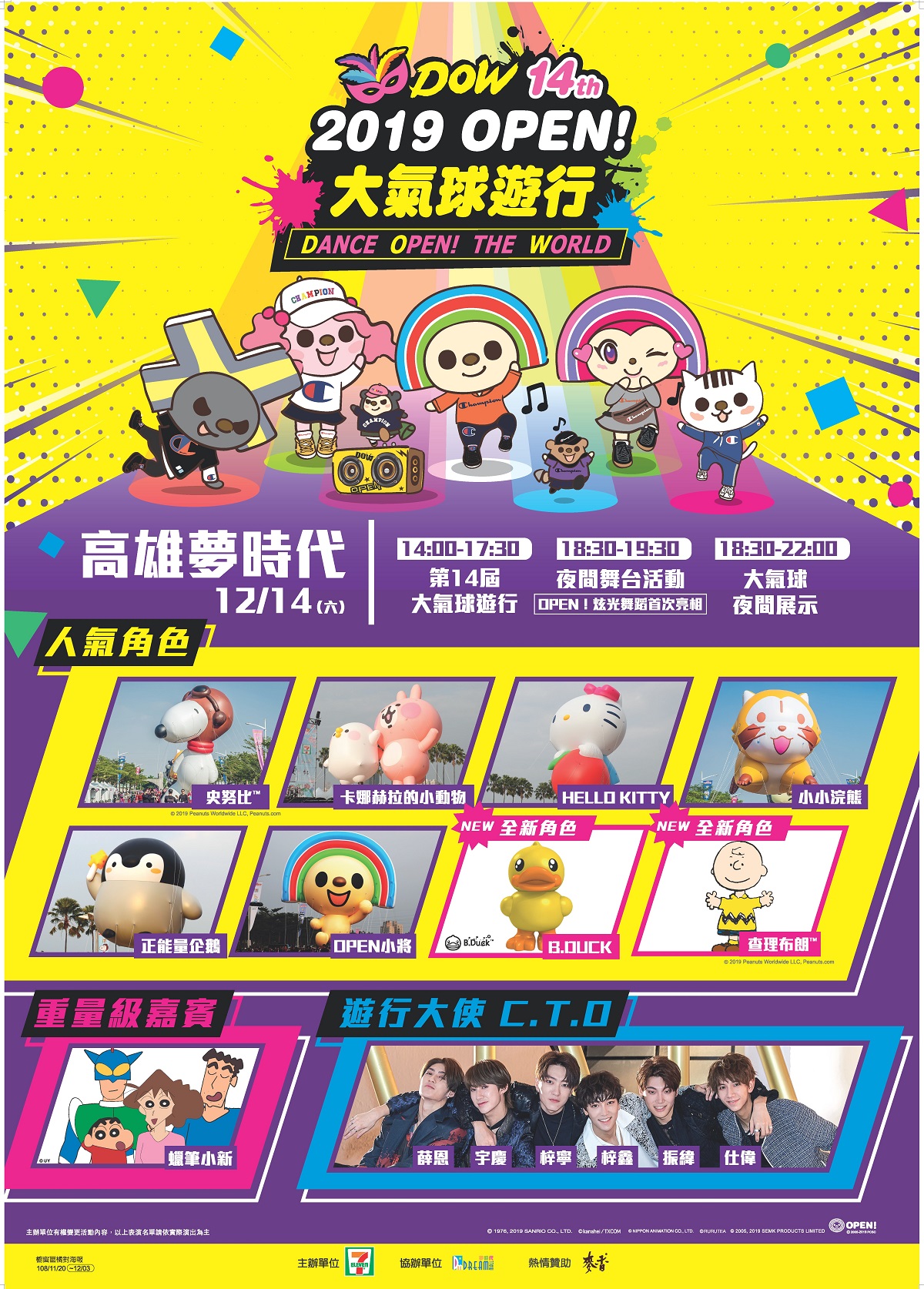 ▼今年「OPEN!大氣球遊行」動員20組肖像巨型氣球,除了OPEN!全員到齊,還有史努比、查理布朗、卡娜赫拉的小動物、HELLO KITTY、正能量企鵝、比得兔、B.DUCK、小小浣熊、雪鈴兔波波,更有蠟筆小新、比得兔、庫樂貓、雪樂貓、美樂蒂人偶超萌亮相,可愛魅力無法招架,絕對讓大小朋友超滿足。