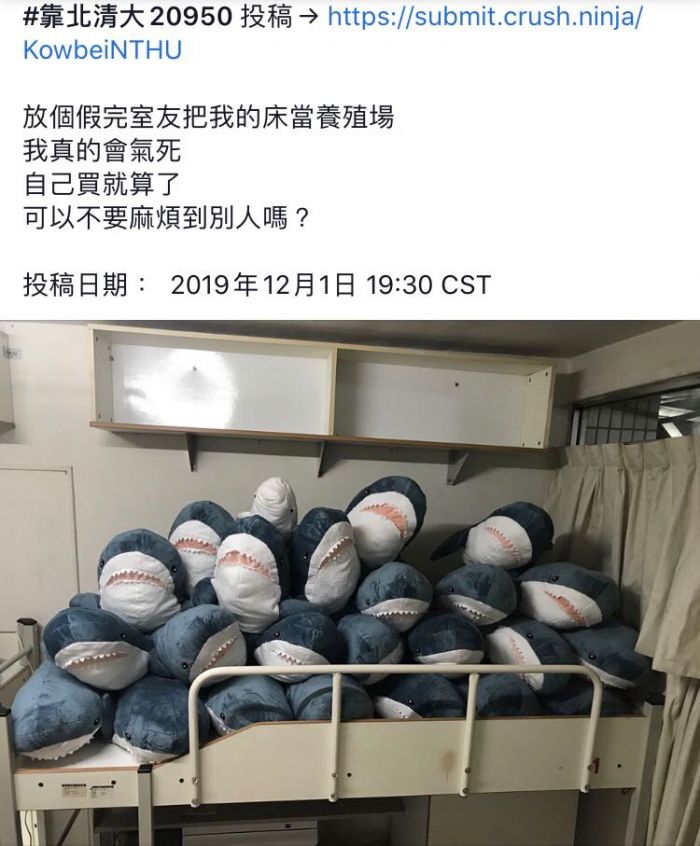 ▼原po一開始是在臉書社團「靠北清大」當中,分享了室友趁他放假不在時,把他的床當做「養殖場」擺滿了鯊魚娃娃的照片,同時氣憤的表示「自己買就算了,可以不要麻煩到別人嗎?」