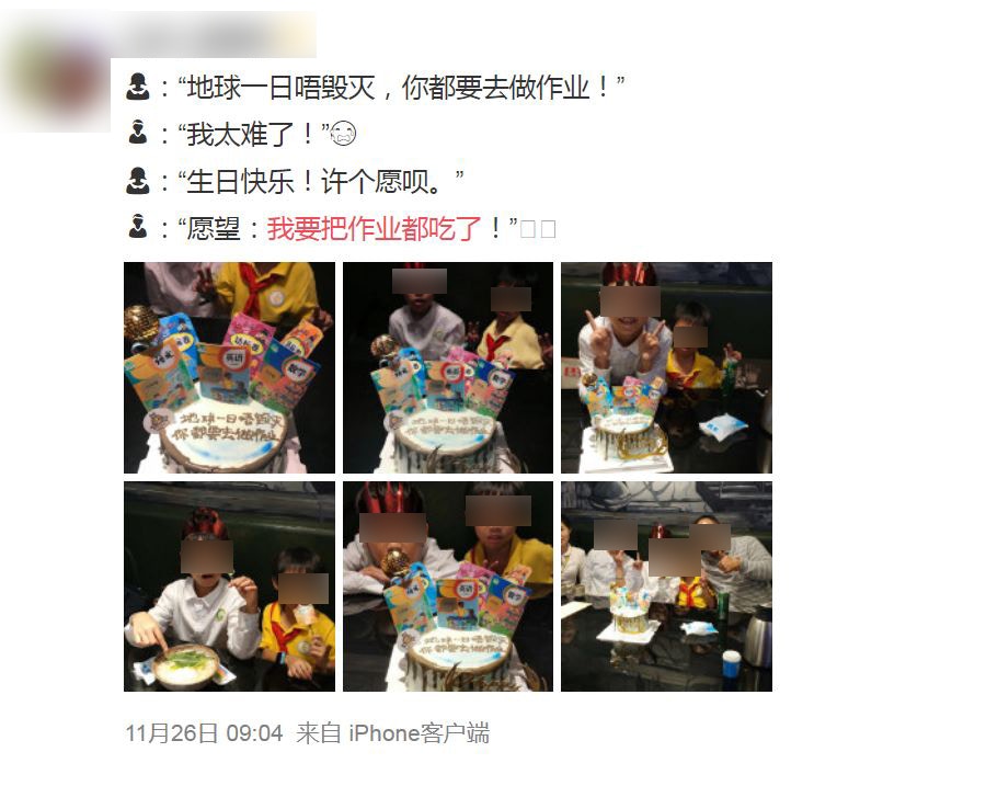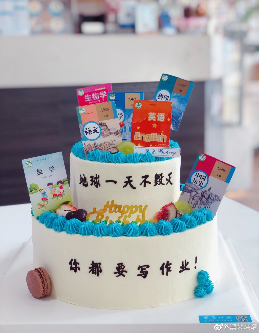 ▼這名小壽星大約六七歲,他面前的生日蛋糕上沒有可愛的卡通人物,反而立滿了好多科目的作業,語文、英語、數學應有盡有,蛋糕上還寫著一句話:「地球一日不毀滅,你都要去做作業」。原本應該最醒目的「Happy Birthday」牌子被擠在後面,都要看不到了。