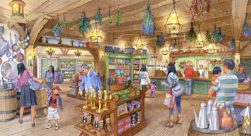 ▼以貝兒借書的場景為發想,園區內也會有鄉村風商店。這次搶先釋出多樣周邊,包括玻璃杯套組、加斯頓抱枕等,到時候應該會買到失心瘋啊~