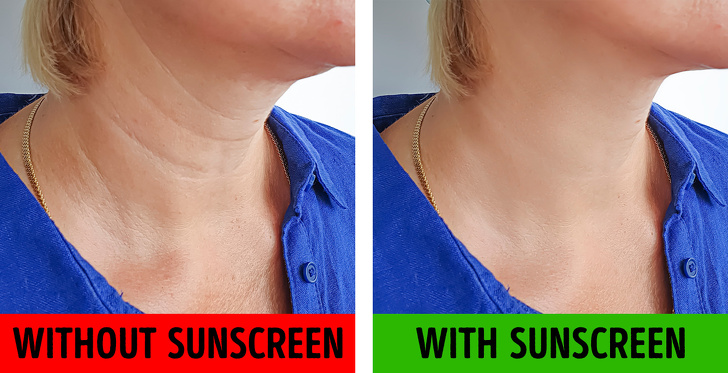 ▼11.出門要防曬:皮膚鬆弛、雙下巴都是衰老的特徵之一。不注意防曬的話,衰老速度會變快。專家建議每天出門時使用SPF30或防曬指數更高的防曬霜,來保護臉部和頸部嬌嫩的皮膚。