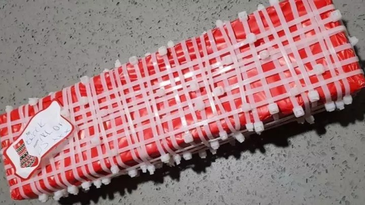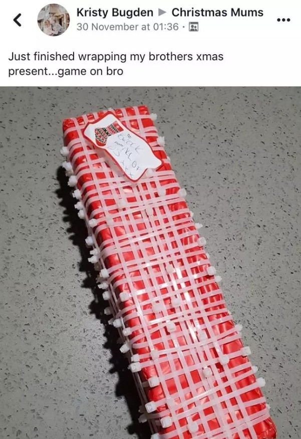 ▼從事零售業的克麗絲汀(Kristy Bugden)就為哥哥準備了一個「特別包裝」的禮物,原來她在禮物的最外層使用了許多「束繩帶」作為包裝,還在臉書中寫道:「剛準備好我哥的聖誕禮物,讓遊戲開始吧!」