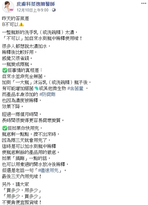 ▼皮膚科醫師蔡逸姍日前在臉書上解釋了「洗碗精加水稀釋」的做法,不僅沒有辦法把手和碗盤清洗乾淨,甚至有可能會造成細菌滋生!原來自來水並不是完全無菌的,在加入沐浴乳或洗碗精之後,有可能會增加產品本身的含菌量,長時間後容易使產品變質,清洗的效果也會明顯降低!