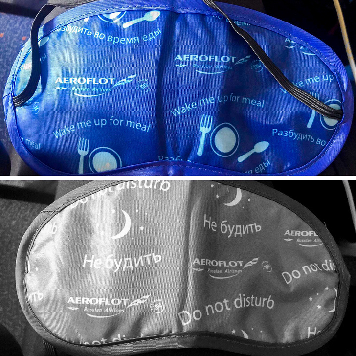 ▼飛機上的眼罩2面顏色不同,藍色的一面代表「用餐時叫醒我」;灰色的一面是「讓我好好睡」。