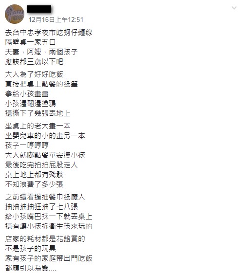 ▼原po在文中表示,自己在台中忠孝夜市吃蚵仔麵線時,目睹隔壁座一家五口的3個大人,帶了2個三歲以下的小孩前來用餐。為了讓自己能夠好好吃飯,大人竟然把桌上點餐用的紙筆拿給小孩畫畫,而小孩也又翻又畫,還揉了幾張丟在地上。