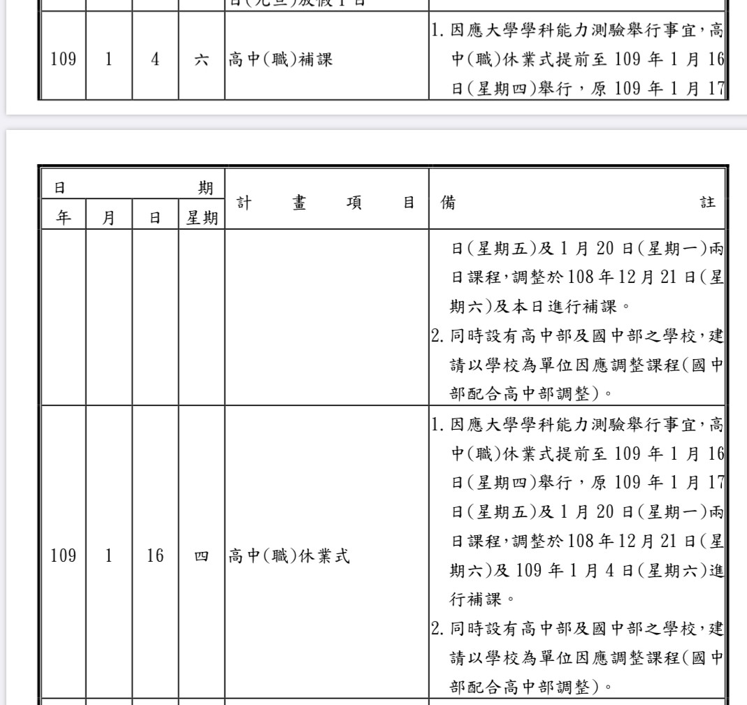 (一)高級中等學校108學年度第1學期休業式,提前於109年1月16日(星期四)辦理。