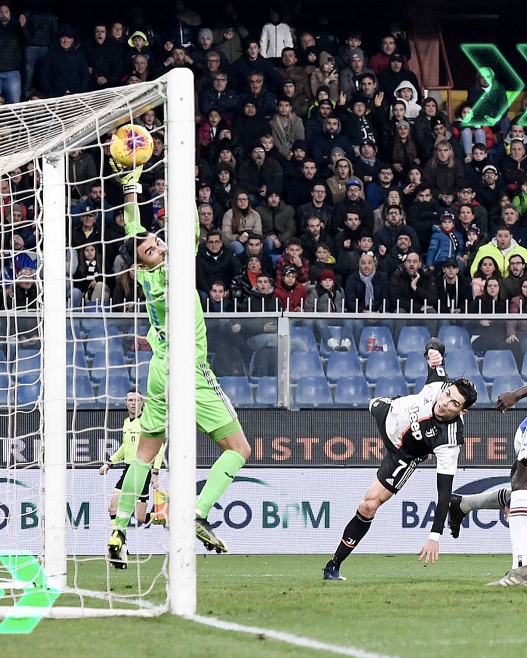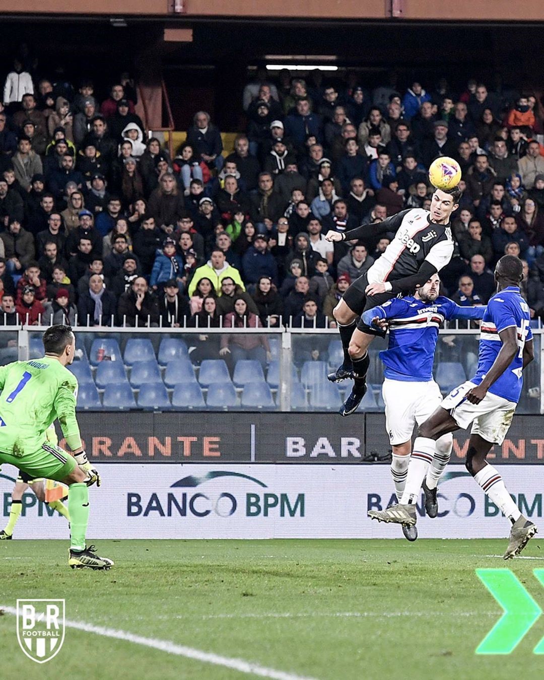 ▼這個精彩瞬間發生在比賽約45分鐘的時候,當時 Alex Sandro 從左側把球傳到場中,C羅則直接高高跳起,用頭頂球的方式成功射門,讓尤文圖斯成功以1分之差獲勝!