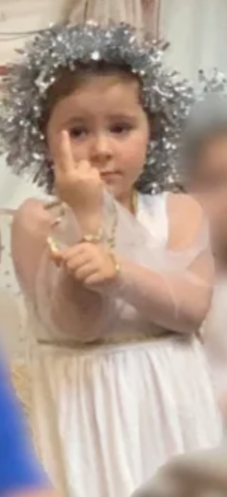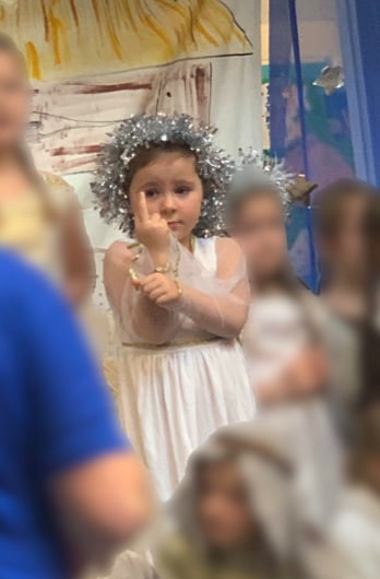 2019年12月20日每年的聖誕節除了家裡會慶祝,學校也會有很多的活動讓小朋友參加。日前一名媽媽Carla Bovingdon就分享了自己女兒在演「耶穌誕生舞台劇」的照片,沒想到網友一看…小女孩竟然在「豎中指」耶?一副若無其事的模樣讓大家都笑歪了~
