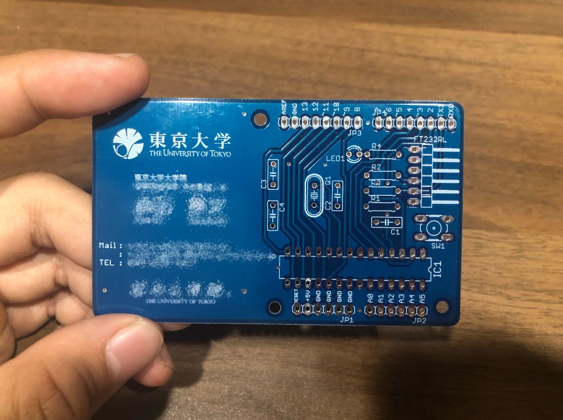 ▼日本一名網友收到了高中同學的名片,沒想到那是用一張藍色的電路板製作的。名片的尺寸跟普通的名片差不多,厚度卻是普通名片的3倍。上面印有東京大學的LOGO,還有詳細的個人資訊。