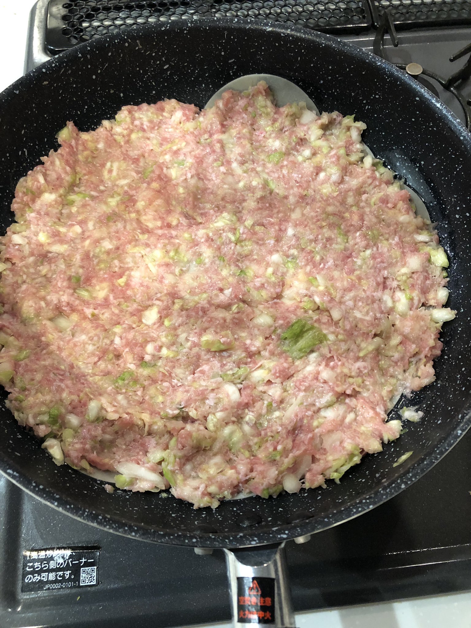 ▼最後在餡料的上方覆蓋另外一層餃子皮,這樣就可以開火慢慢煎熟了!