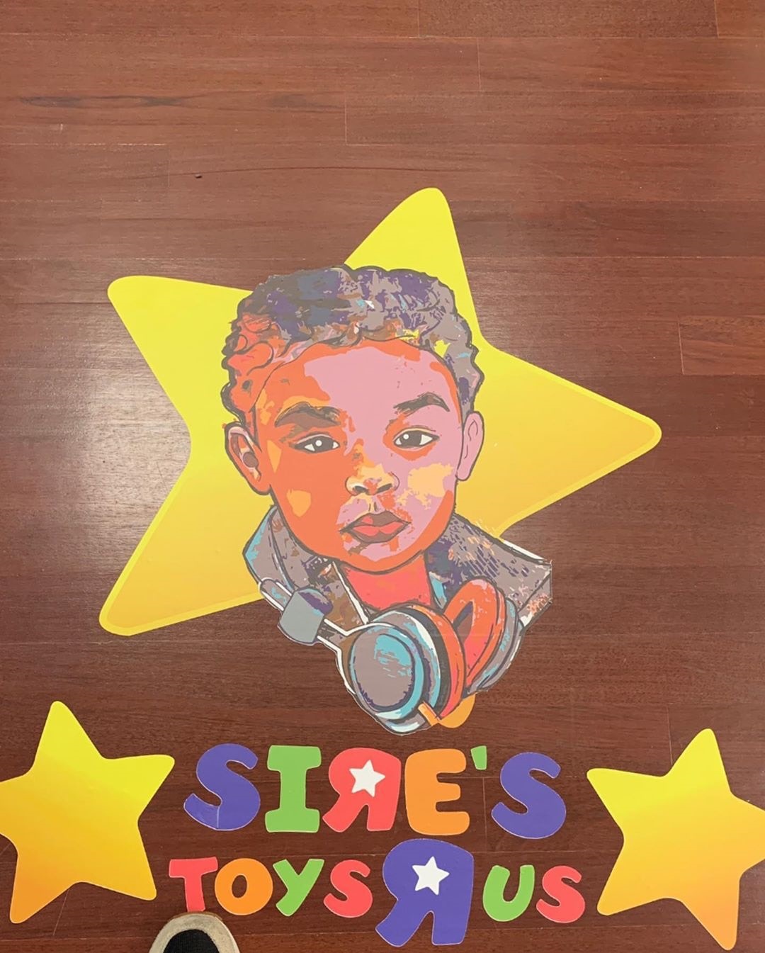 ▼玩具反斗城裡貼滿了Sire的圖片和名字。50 Cent和兒子一起,拿著玩具、樂高積木等等,玩得非常開心。
