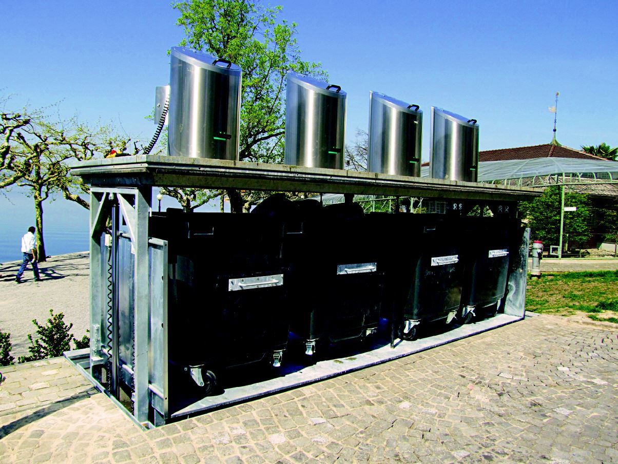 ▼按一下按鈕就可以讓下層的儲存槽升起來,然後垃圾車就可以直接載走儲存槽,完全不用雙手去碰觸垃圾,非常有效率。