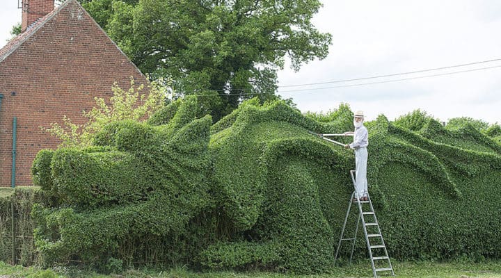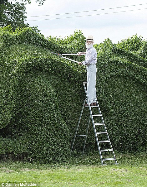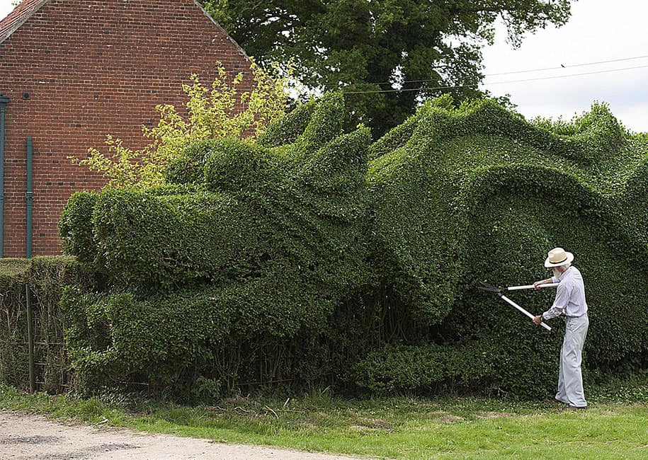 ▼John接受採訪時說,有一天他站在廚房裡透過窗戶看外面的風景,突然覺得這片圍籬又高又素,沒有任何造型,看起來很無趣。於是他決定做一些改變,沒想到一剪就是13年。