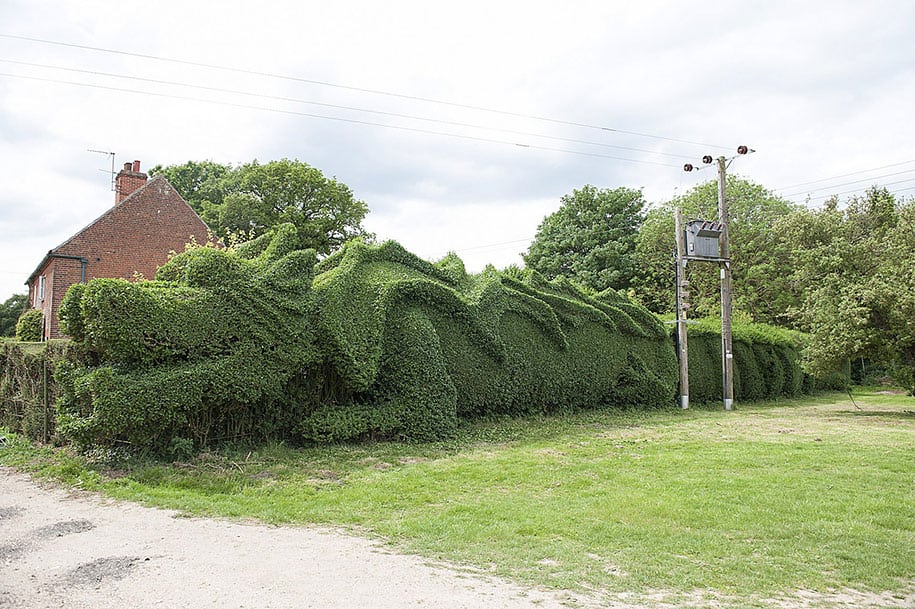 ▼John將圍籬修剪成了一條45公尺長的超霸氣巨龍。以前他沒有接觸過園藝,這麼多年只用一座梯子和一把剪刀,自學成才成為了園藝高手。