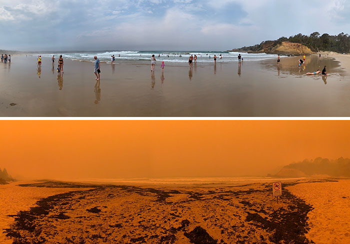 ▼2.新南威爾斯州的Tathra海灘。天空變成紅色,沙灘上全是黑乎乎的黑灰。
