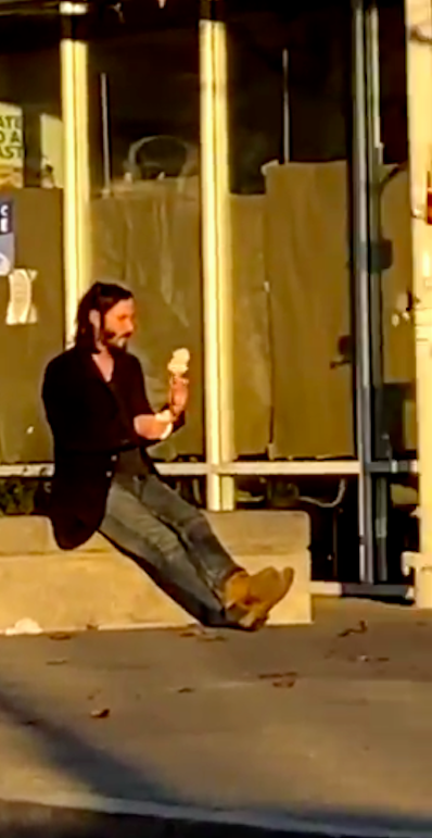 ▼當天下午,基努李維一個人坐在加州一間「31冰淇淋」外享用美味的甜品。一名女網友看到他,忍不住拿出手機拍影片,她還跟朋友爭論這個在夕陽下吃冰淇淋的男人是不是基努李維。