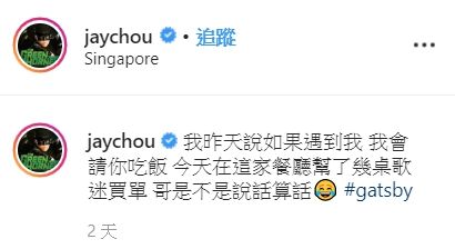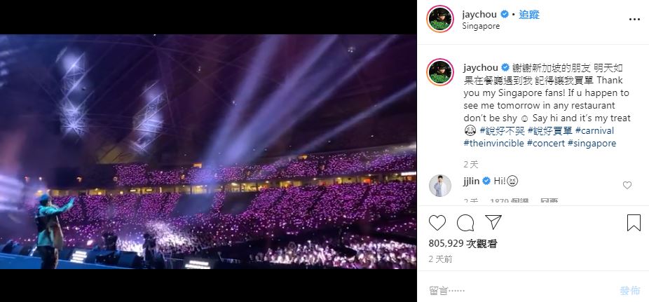 ▼1月11日,周杰倫在新加坡開演唱會時與台下的粉絲分享了一段趣事:「今天幫幾桌歌迷買單,明天還是待在新加坡,遇到我一樣請客。」後來他還在IG發文,證明自己說話算話。粉絲們紛紛猜測他的用餐地點,希望能夠跟偶像巧遇。