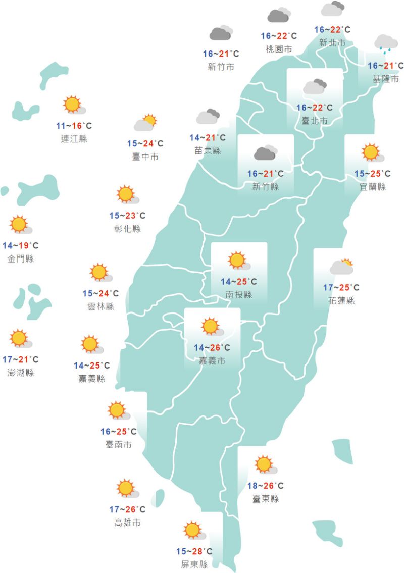 ▼明天開始將有冷空氣南下,北台灣溫度也會跟著驟降,北部及東半部有局部短暫雨的機率。明晚的氣溫降至最低達11度,或達冷氣團等級。苗栗以北平地低溫大約落在11-12度、台北及其他地區則降至12-14度,周六開始從濕冷轉為乾冷。