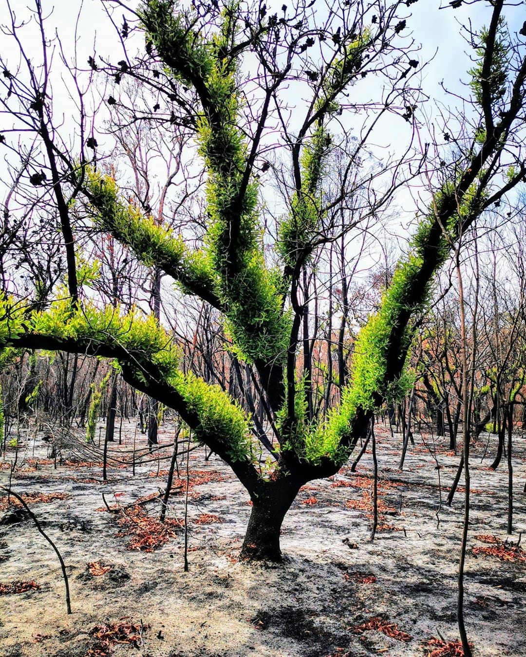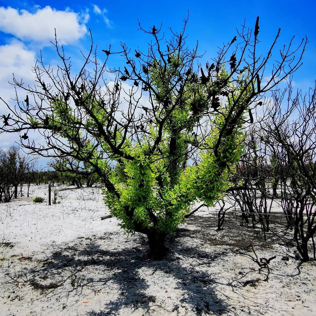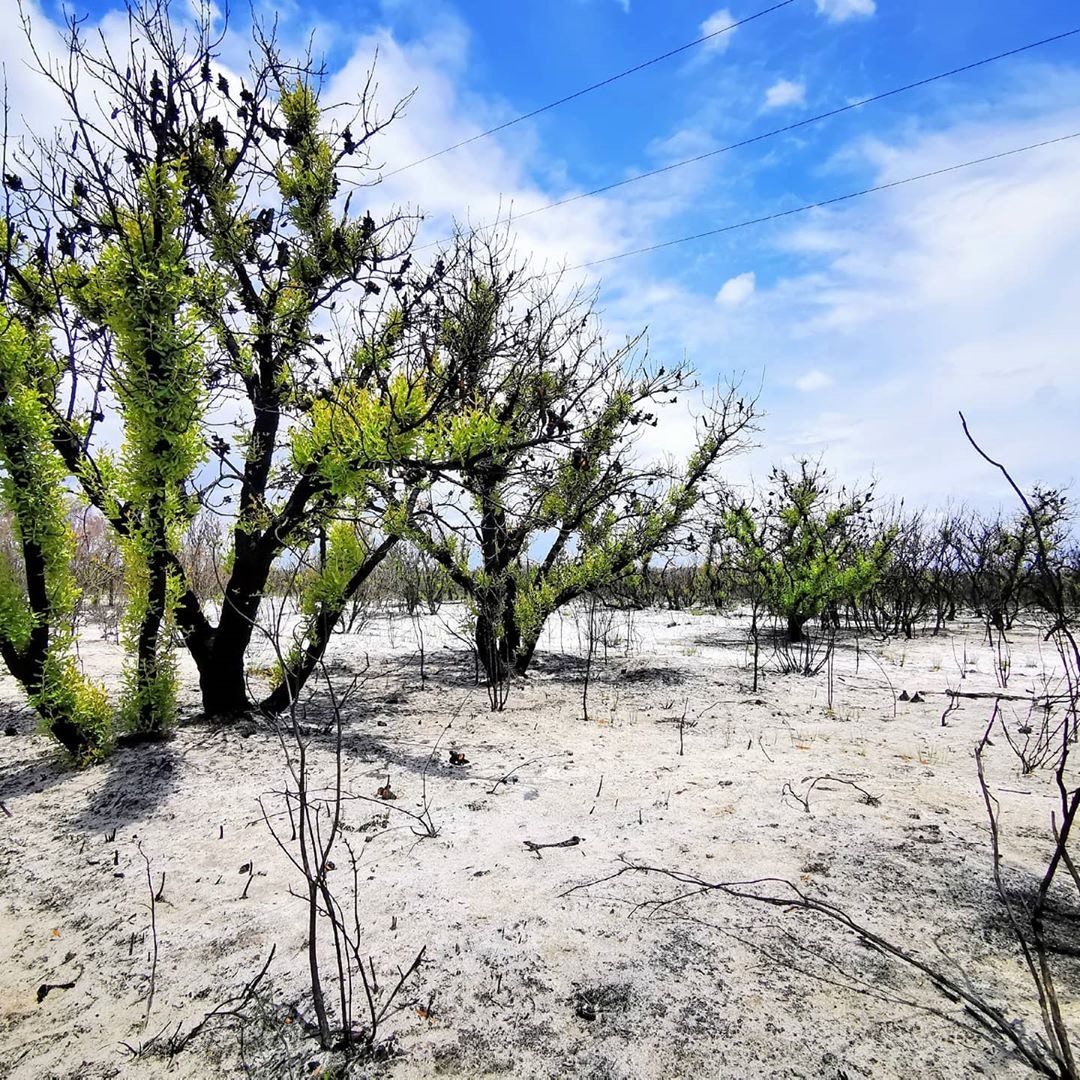▼雖然植物表面有燒過的痕跡,但一場大雨過後,這些枯枝上竟重新長出嫩芽,部分樹枝甚至長滿綠葉,看起來生機勃勃。