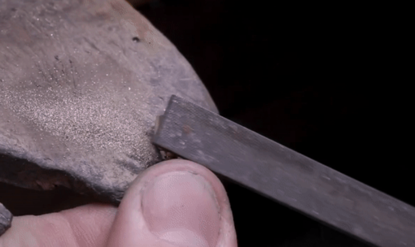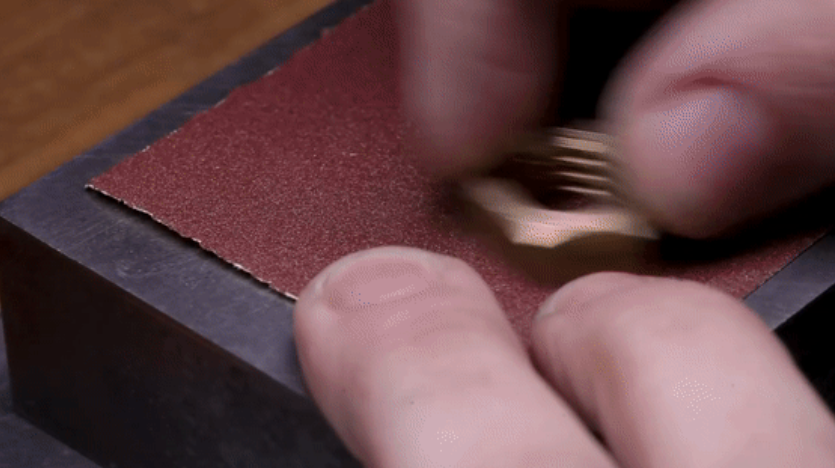 ▼使用工具修飾鑽托底部,這一部必須很小心,切割金屬時力氣大一點或小一點都不行。還要退火處理,讓尺寸更穩定,防止變形;