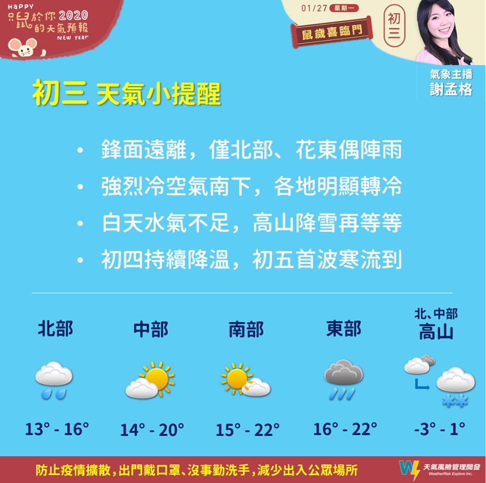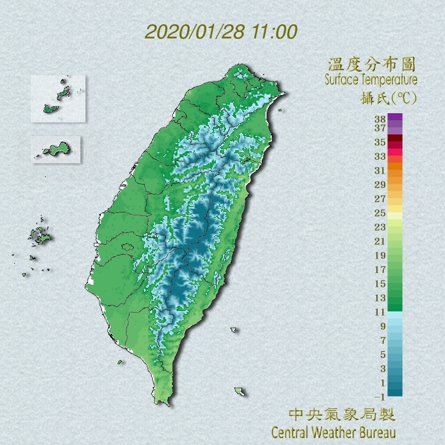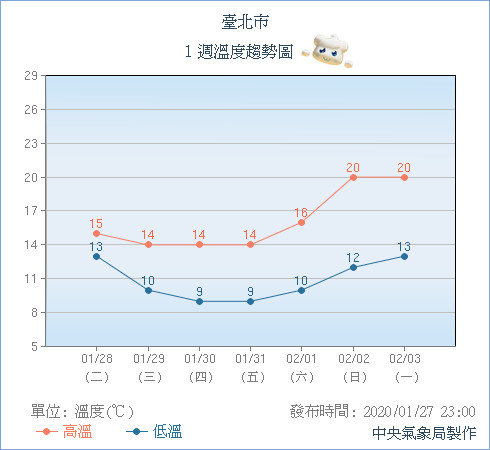 ▼氣象局預報,寒流逐漸南下,各地氣溫偏低,1月29日以後非常寒冷,強度已經達到「寒流」等級,這幾天高山很可能降雪。預計29日到2月1日都會受寒流影響,月底將達到最低溫,台南以北和東北部下探8度,空曠地區近山區平地氣溫可能更低,高屏和花東為12至14度左右,白天北部高溫也只有15度左右。
