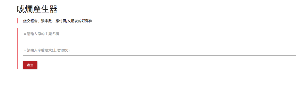 2020年01月29日人生就是要耍廢才會過得健康又快樂~網友徐子修開發的「唬爛產生器」只要輸入主題名稱與字數要求,不到幾秒的時間內就可以產出一堆「看似合理」的長文,讓你不再害怕面對交報告,甚至連應付另一半也可以得心應手!