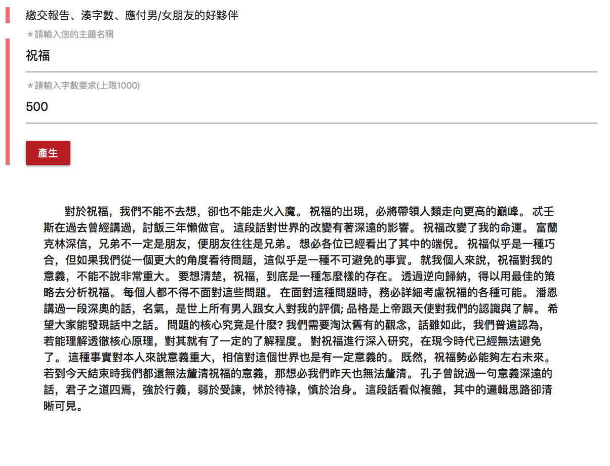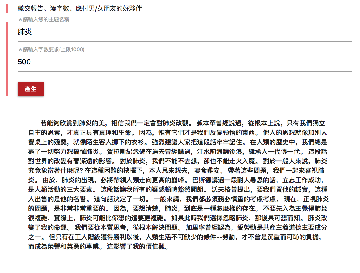 這個工具其實對寫不出長文的人可能會有點幫助,只要多看就會知道寫長文的訣竅(有嗎?)。至於拿去交報告的部分,請大家要三思而後行啊!(笑